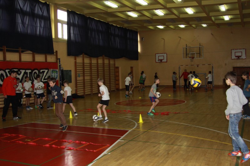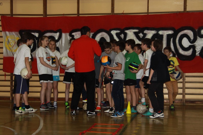 W sali gimnastycznej szkoły odbyły się zajęcia z grupą uczniów z klas 4-6. Najpierw ćwiczyli chłopcy, a później mniej liczna, ale bardzo ambitna grupa dziewczynek, z których część trenuje koszykówkę w drużynie Księżaka Łowicz. Uczniowie wykonywali ćwiczenia ruchowe łączące ze sobą elementy gry w piłkę nożną oraz koszykówkę pod bacznym okiem trenerów Marka Grzeszczakowskiego oraz Piotra Filipka.