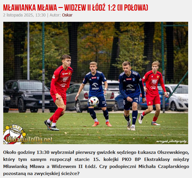 „Około godziny 13:30 wybrzmiał pierwszy gwizdek sędziego Łukasza Olszewskiego, który tym samym rozpoczął starcie 15. kolejki PKO BP Ekstraklasy między Mławianką Mława a Widzewem II Łódź.” – dobre, ekstraklasowe starcie :-)