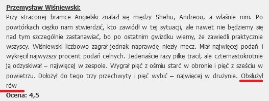 Z całym szacunkiem do Kapuadiego, który nie zdążył wiele pokazać, ale tej zmiany kompletnie nie rozumiemy. Wyglądała jak pokazanie kibicom „nowej zabawki”. Trzy razy futbolówkę tracił i sześciokrotnie odzyskiwał. Stoczył tylko jeden pojedynek w powietrzu i go wygrał, a do tego dołożył jedno wybicie.