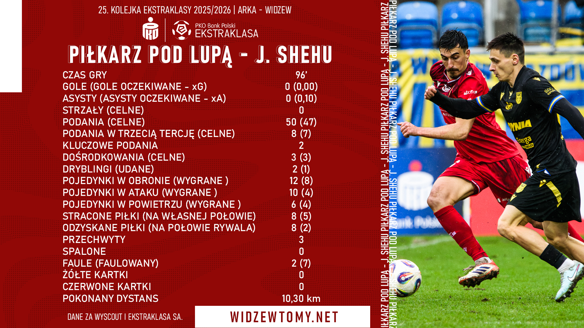 17 marca 2026, 20:53 | Autor: RyanZachęcamy do zapoznania się ze szczegółowymi danymi liczbowymi, jakie w niedzielnym spotkaniu 25. kolejki Ekstraklasy z Arką Gdynia osiągnął pomocnik Widzewa, Juljan Shehu. Mecz zakończył się remisem czerwono-biało-czerwonych 0:0.