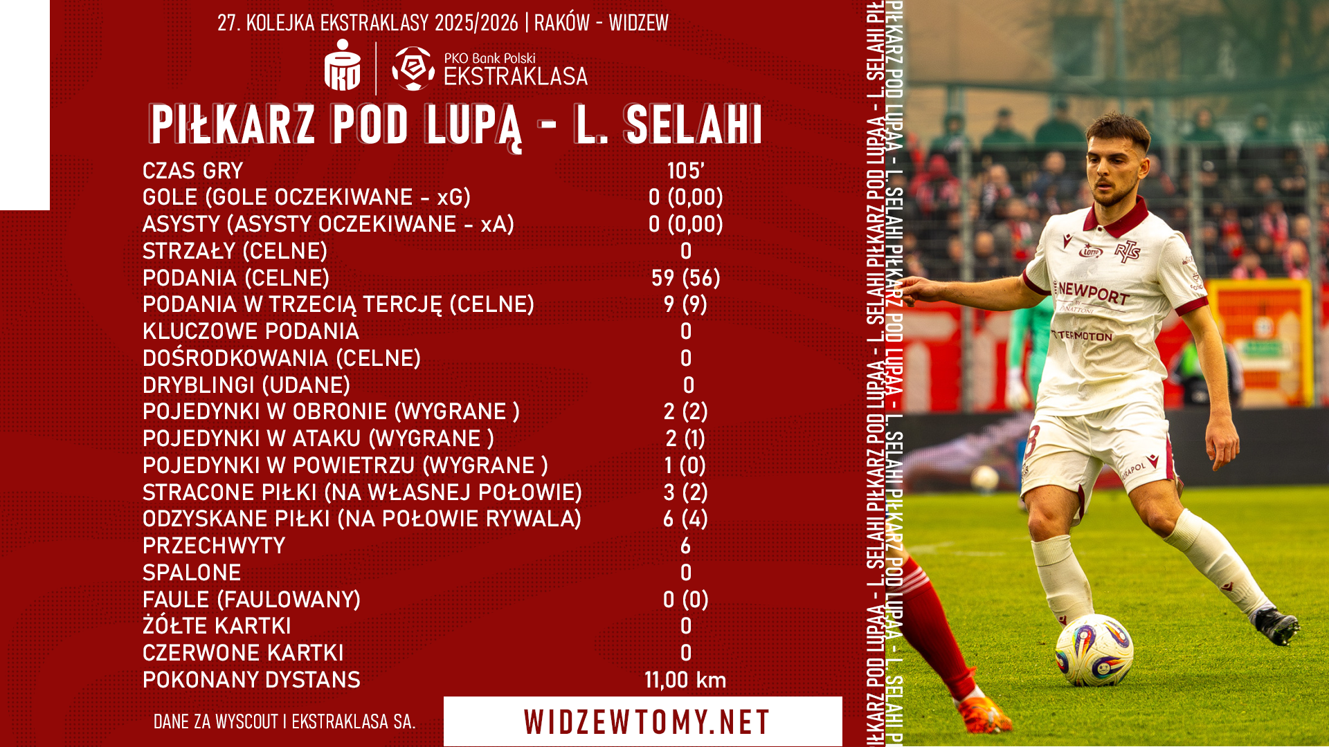 8 kwietnia 2026, 15:50 | Autor: RyanZachęcamy do zapoznania się ze szczegółowymi danymi liczbowymi, jakie w sobotnim spotkaniu 27. kolejki Ekstraklasy z Rakowem Częstochowa osiągnął pomocnik Widzewa, Lindoin Selahi. Mecz zakończył się remisem czerwono-biało-czerwonych 1:1.