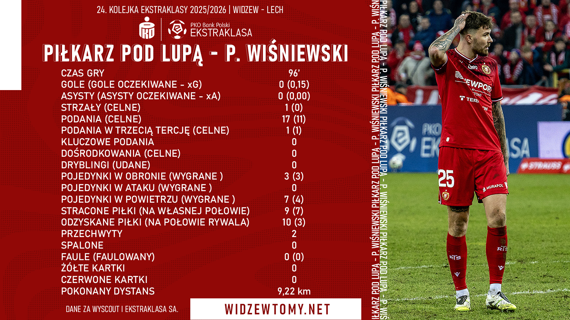 9 marca 2026, 13:02 | Autor: RyanZachęcamy do zapoznania się ze szczegółowymi danymi liczbowymi, jakie w sobotnim spotkaniu 24. kolejki Ekstraklasy z Lechem Poznań osiągnął obrońca Widzewa, Przemysław Wiśniewski. Mecz zakończył się zwycięstwem czerwono-biało-czerwonych 2:1.