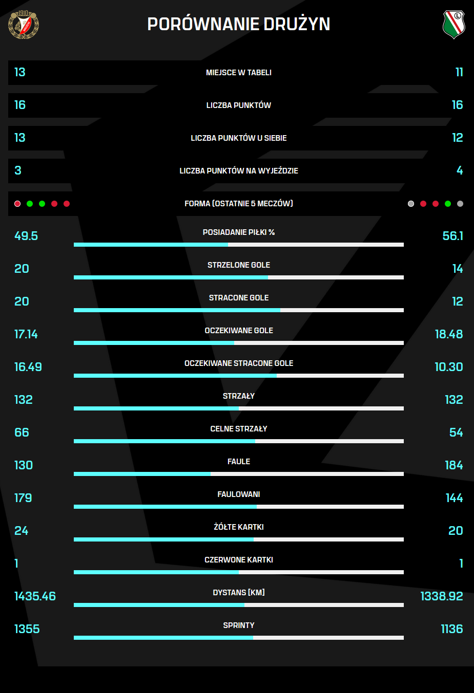Oficjalny dostawca statystyk ligowych, czyli Ekstrastats, przygotował graficzne porównanie liczb obu zespołów. Aby powiększyć obraz z danymi, wystarczy w niego kliknąć: