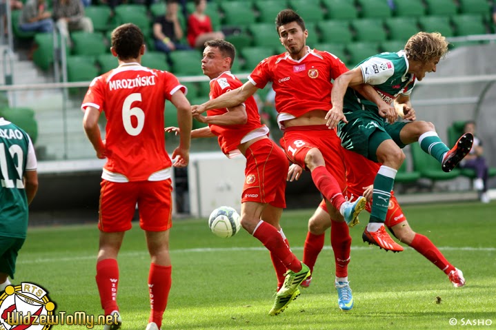 Już początek spotkania pokazał, że znów zmieniona linia defensywna (trenerzy wciąż szukają optymalnego zestawienia) nie jest dziś w najwyższej formie. Kilka podań za plecy stoperów wybiegami ratował Maciej Mielcarz. Widzew starał się odpowiadać głównie zagraniami na Eduardsa Visnakovsa, który w pierwszym kwadransie miał dwie okazje strzeleckie. Raz w ekwilibrystyczny sposób oddał strzał na bramkę, ale Gikiewicz pewnie chwycił piłkę. Później głową posłał futbolówkę metr od słupka. W obu przypadkach dośrodkowywał Stępiński, w obu Łotysz nie miał łatwego zadania.