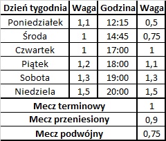 Wykorzystując dane z KRRiT ustalono wagi dla każdego dnia i każdej godziny rozgrywania spotkania w Ekstraklasie. Współczynniki ustalono na podstawie określonych pików telewizyjnych w poszczególnych porach dnia. Dodatkowo dodano również wagę dla meczów rozgrywanych zgodnie z terminem, dla przełożonych spotkań oraz dla tych pojedynków, które odbywają się w tym samym czasie.