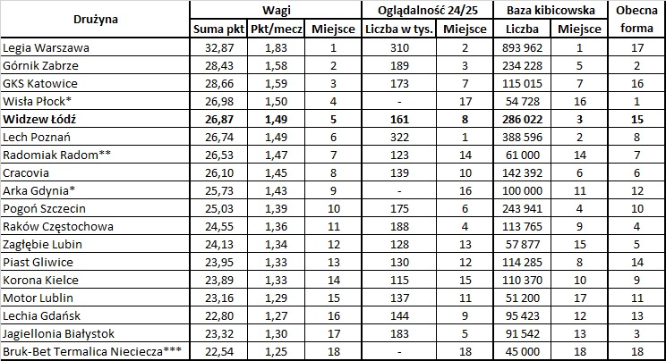 - Wysokie pozycje Wisły Płock, Radomiaka Radom i Cracovii mimo znacznie mniejszej ilości fanów ich miejsce jest wypadkową wysokiej lokaty w tabeli PKO Ekstraklasy.