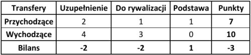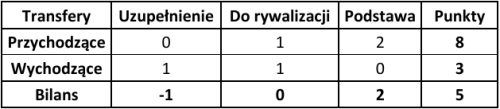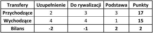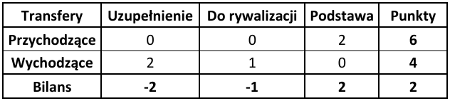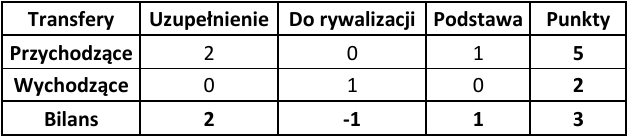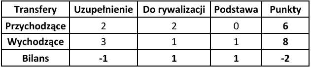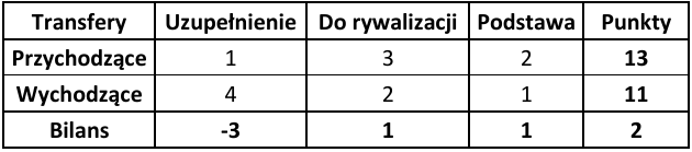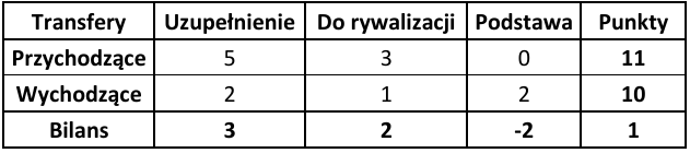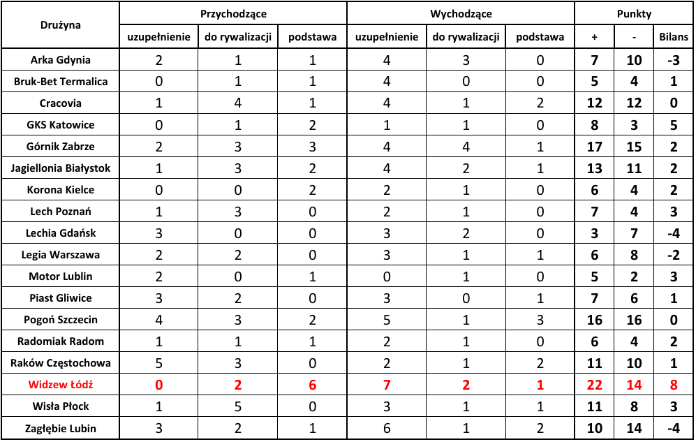 Ostatnim wskaźnikiem wartym odnotowania jest ogólny bilans punktowy, który pokazuje, która drużyna poprawiła swój potencjał kadrowy względem poprzedniej rundy. Zdecydowanie wyróżniają się tutaj Widzew Łódź (+8 punktów) oraz GKS Katowice (+5 punktów). W przypadku Widzewa przyczyna jest dość prosta – zasobność portfela właściciela oraz chęć szybkiej poprawy wyników punktowych. W Katowicach natomiast wydaje się, że nadrzędnym celem jest zapewnienie sobie spokojnego utrzymania w PKO Ekstraklasie.