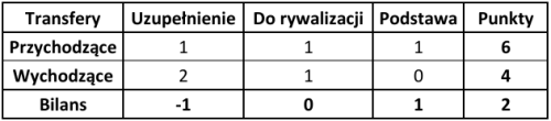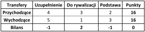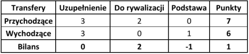 Następnie od sumy punktów transferów przychodzących odejmowano sumę punktów transferów wychodzących, otrzymując finalny bilans. Jeśli w jakimś klubie miała miejsce kontuzja wymagająca dłuższej przerwy lub powrót po takiej kontuzji – również brano to pod uwagę w ostatecznym rozrachunku. Dodatkowo ponownie zweryfikowano wcześniej ocenione transfery, uwzględniając rolę, jaką zawodnicy pełnili w dotychczas rozegranych w tym roku meczach.
