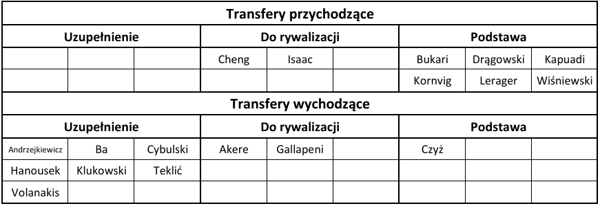 Wzrost jakości jest widoczny gołym okiem. Według Transfermarkt wartość kadry wzrosła z 28,825 mln do 40,80 mln euro (o 41,5%), co daje trzecie miejsce w lidze (zaraz za Lechem Poznań i Rakowem Częstochowa).