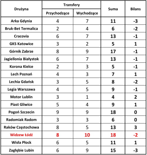 Na podstawie powyższej tabeli możemy łatwo zauważyć, która drużyna sprowadziła lub sprzedała najwięcej, a która najmniej zawodników. Pod względem łącznej liczby ruchów transferowych zdecydowanie wyróżniają się trzy drużyny – Pogoń Szczecin i Widzew Łódź, dokonując łącznie aż 18 transferów oraz Górnik Zabrze, który przeprowadził 17 transakcji. Na drugim biegunie znajduje się Motor Lublin (4 zmiany w kadrze), a także GKS Katowice i Korona Kielce (po 5 ruchów).