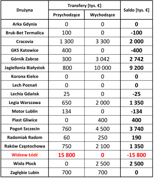 - Widzew Łódź – 15,800 mln € (rekordowe wydatki w historii klubu)