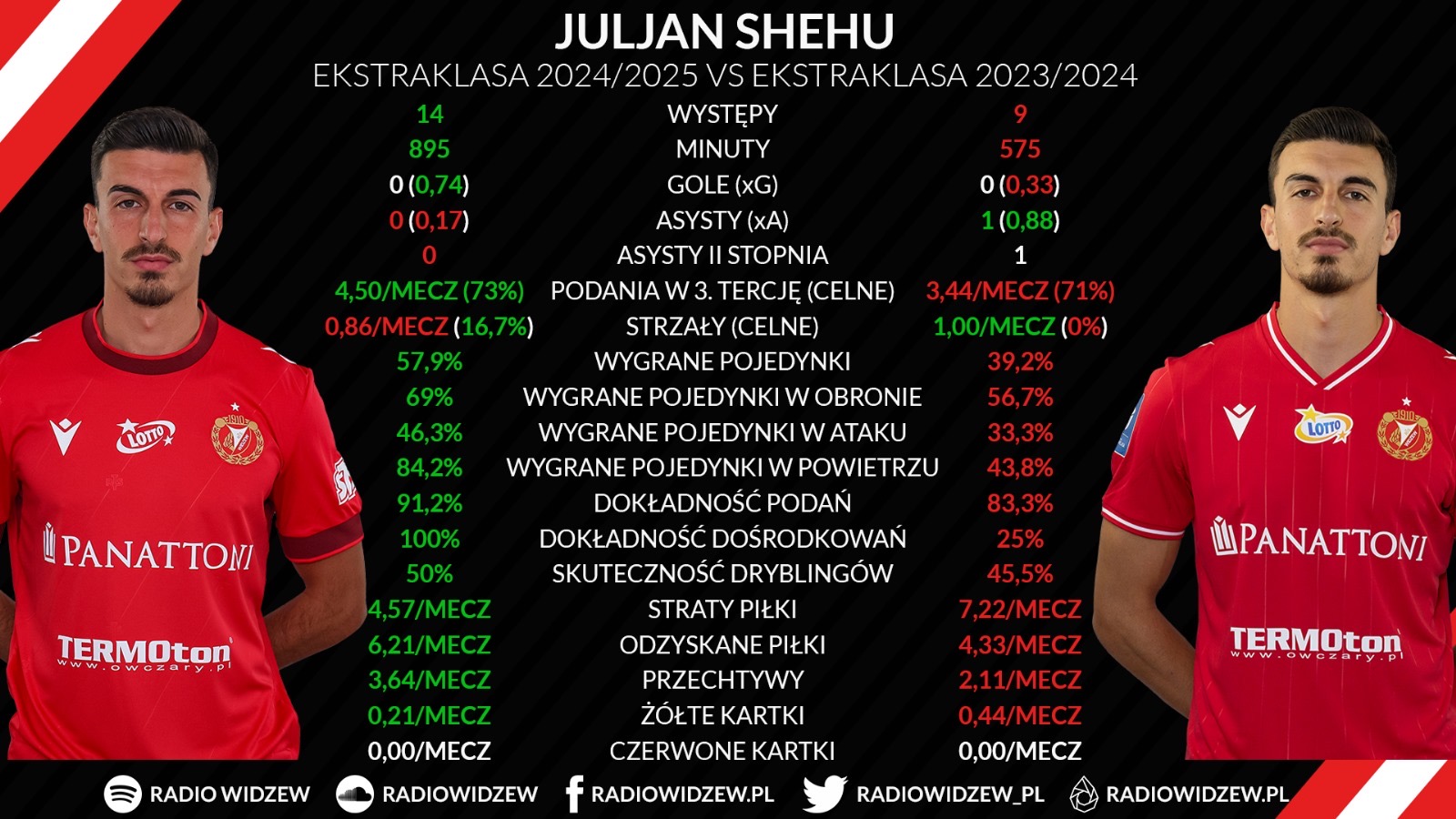 Te ważniejsze liczby dla piłkarza grającego na „szóstce” znacznie się poprawiły. Juljan Shehu jest piłkarzem zdecydowanie lepszym, który razem z Sebastianem Kerkiem i Franem Alvarezem tworzą jeden z najlepszych tercetów pomocników w Ekstraklasie. Jego celność podań (z zachowaniem wszelkich proporcji) można porównywać do najlepszych pomocników na świecie, grających na tej samej pozycji. Pamiętajmy również, że 26-latek jest raczej piłkarzem Widzewa, który ma najmniej miejsca i najmniej czasu na zastanowienie się, a to i tak nie przeszkadza mu w dopisywaniu kolejnych dobrych występów. Zachęcamy Was do przyjrzenia się statystykom Albańczyka z poprzednich lat.