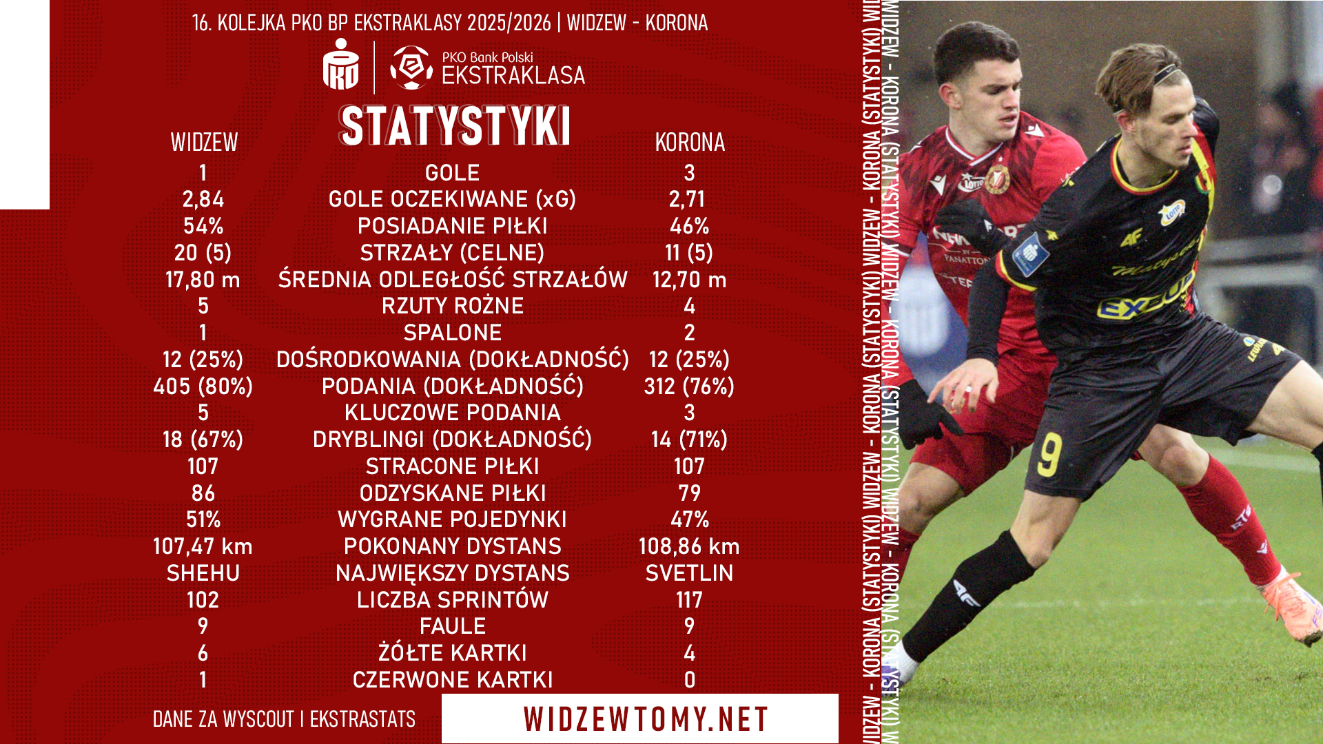 24 listopada 2025, 15:56 | Autor: RyanZapraszamy do zapoznania się ze szczegółowymi statystykami spotkania 16. kolejki Ekstraklasy pomiędzy Widzewem Łódź a Koroną Kielce, jakie odbyło się w minioną niedzielę. Domowa potyczka zakończyła się porażką drużyny Igora Jovićevicia 1:3.