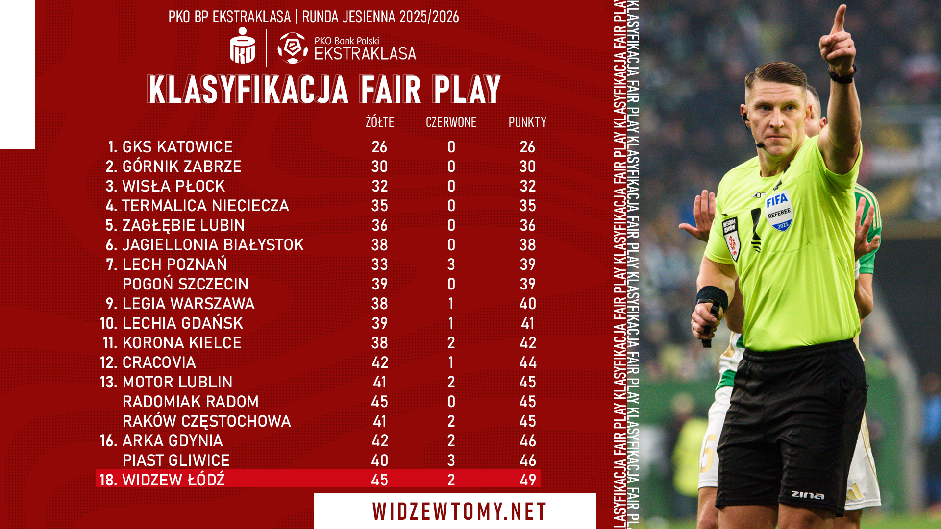 19 grudnia 2025, 13:21 | Autor: RyanW zakończonej w miniony weekend rundzie jesiennej sezonu nie było drużyny częściej karanej żółtymi kartkami, co Widzew. Dodając do tego dwa czerwone kartoniki dla łodzian, zajęli oni ostatnie miejsce w klasyfikacji fair play!