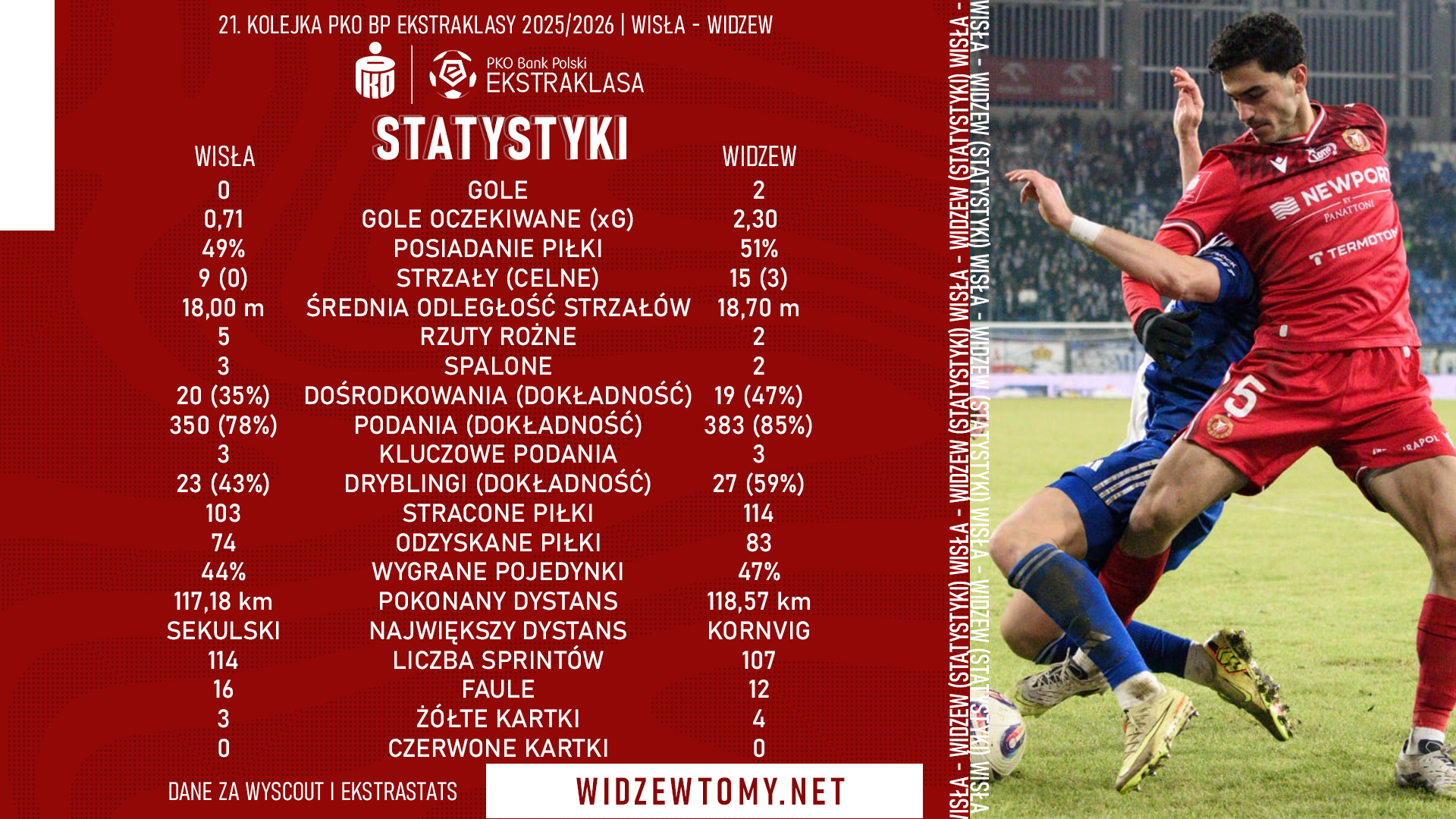 16 lutego 2026, 17:43 | Autor: RyanZapraszamy do zapoznania się ze szczegółowymi statystykami spotkania 21. kolejki Ekstraklasy pomiędzy Wisła Płock a Widzewem Łódź, jakie odbyło się w minioną sobotę. Wyjazdowa potyczka zakończyła się zwycięstwem drużyny Igora Jovićevicia 2:0.