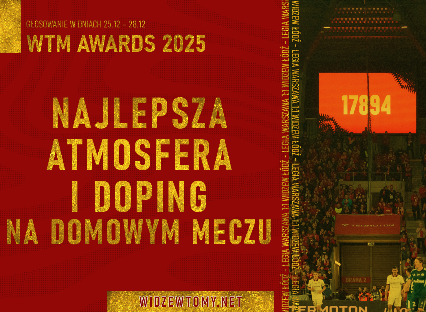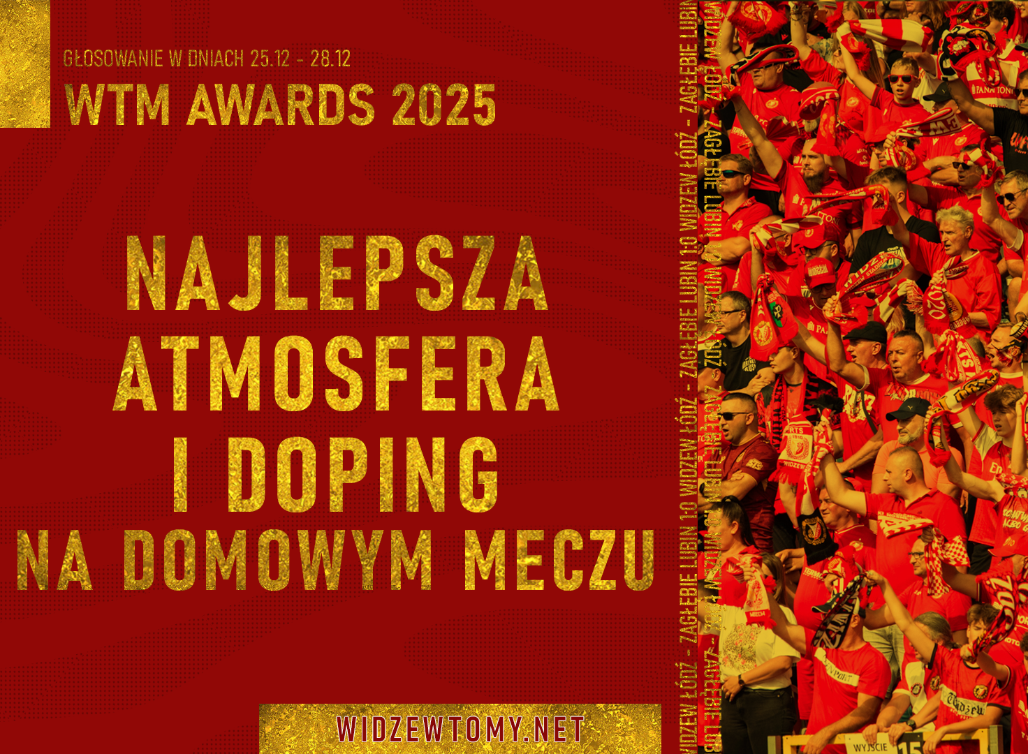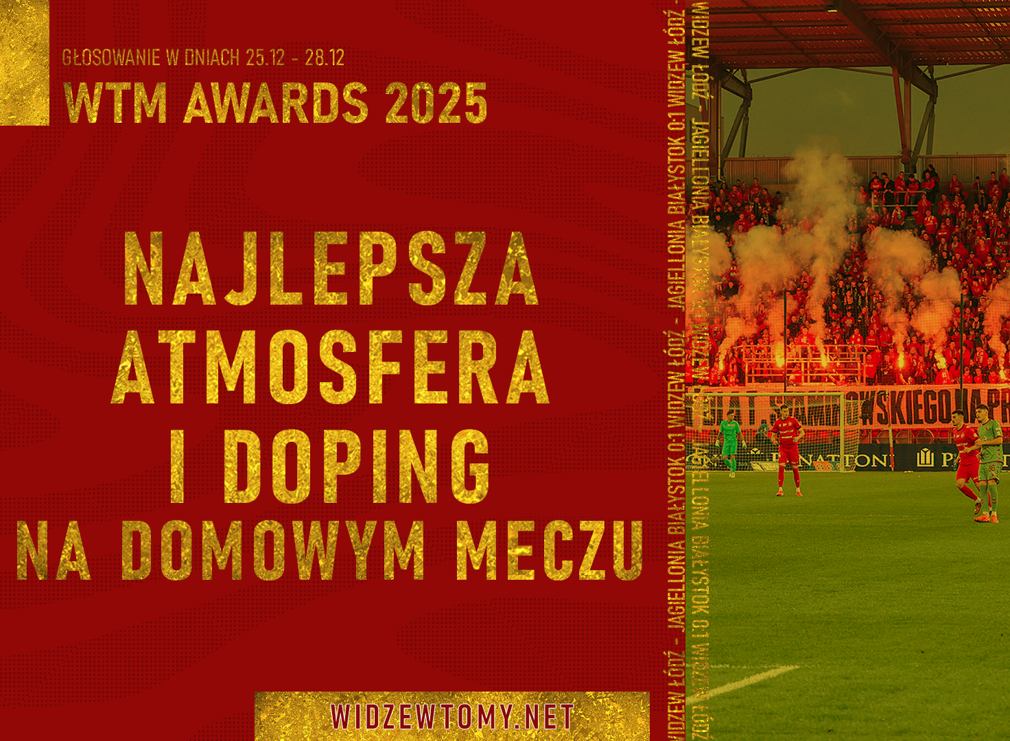 25 grudnia 2025, 16:29 | Autor: RyanW wigilijną środę zakończyło się pierwsze głosowanie w plebiscycie Widzewskie Trofea Mistrzów – WTM Awards 2025! Od dziś można decydować o tym, kto zdobędzie nagrodę w drugiej kategorii: „Najlepsza atmosfera i doping na meczu”. Poznajcie piątkę nominowanych przez naszą Redakcję!