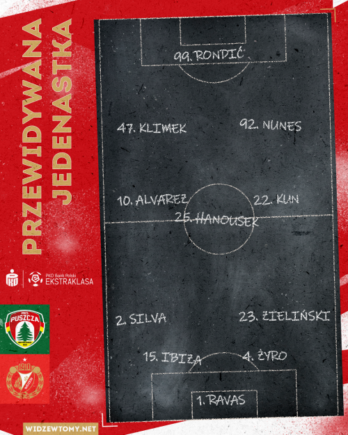Względem ostatniego ligowego spotkania przewidujemy dwie zmiany. Na lewej obronie stawiamy na Luisa da Silvę, który zagrał bardzo dobre spotkanie w Pucharze Polski. Portugalczyk zmieni Andrejsa Ciganiksa. Do drugiej z zakładanych przez nas roszad powinno dojść w ataku. Według nas Imad Rondić wskoczy w miejsce Jordiego Sancheza. Bośniak również ma za sobą udane zawody w Pucharze Polski, które zwieńczył zdobytą bramką.